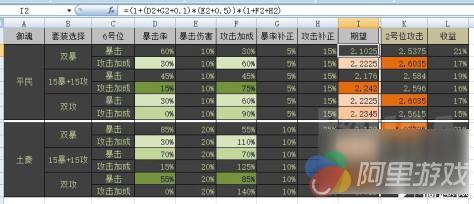 暴击率补正为各副属性总和,角色基础暴击率10%,已计入公式,不在单元格中体现。(平民组取5%,土豪组取15%)为方便计算分析,引入攻击加成补正,固定攻击增量(如御魂1号位及其他副属性固定攻击)统一折算为百分比进行累加。(平民组取15%,土豪组取25%)