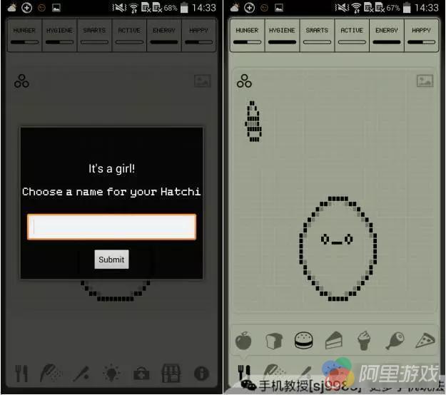 跟以前的电子宠物一样,你需要给它喂食、洗澡、陪玩耍、生病打针,这只Hatchi小怪兽将经历若干成长阶段,以不同的方式发育,具体取决于玩家是怎样照顾它的。画面顶部就是小怪兽的6个状态指标,从左到右分别是饥饿程度、卫生状态、智力发育、体能、能量、开心程度。宠物的进化方式和这些状态密不可分,所以要多注意这些状态变化和宠物进化的方式并找出规律哦~努力获得所有的最终形态。