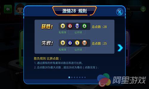 看到上图,相信你们也已经猜到了吧~没错,激情28的玩法很简单,那就是比拼所拥有的桌球点数总和~总点数的最大点数为28点,如果你不小心超过了28点,也就是爆点,那你的点数无效。