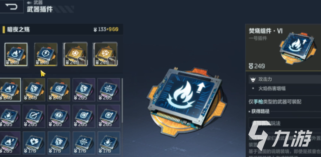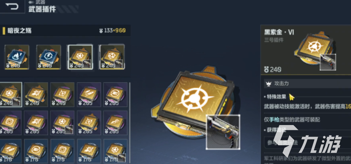 第三组是黑索金,而这一插件是伤害的核心,没有任何其他插件能够替代,而造成的效果也更为直接,能够100%的进行武器伤害提升,他所提升的并不只是基础伤害,是将“额外伤害+基础伤害”进行整体倍率提升,如枪支原本可以打出1000点的伤害,但有了这个插件的加持,可以直接提升到2000,对于一些比较难打的boss,能够造成比较高的单体爆发伤害,并且在操作难度系数上也很低,萌新玩家轻松上手不是问题。