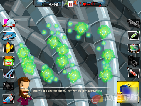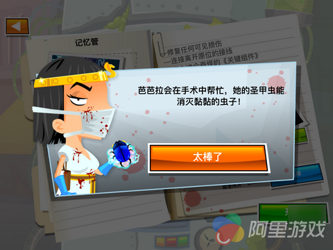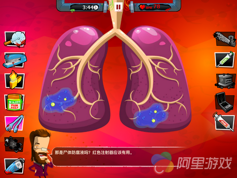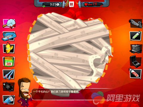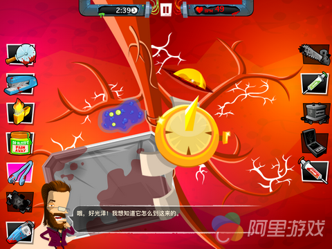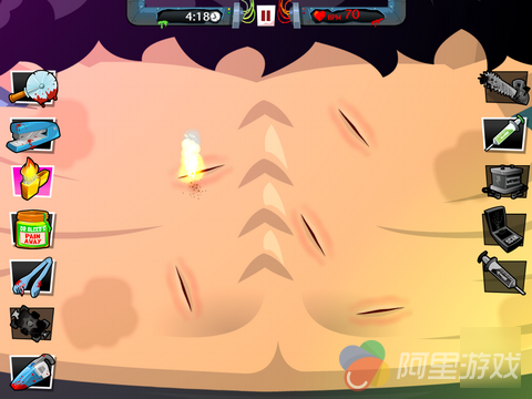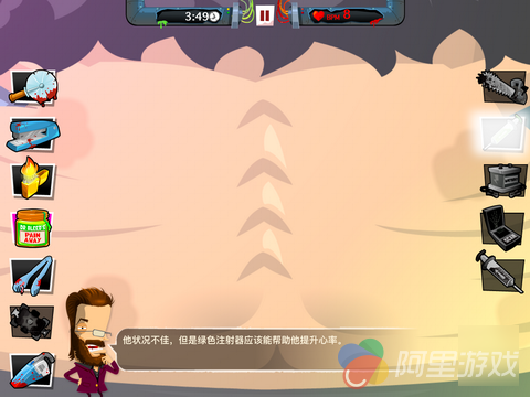 在游戏初期的几个关卡中,玩家将跟随着游戏的相关提示熟悉本作的玩法以及操作,最重要的就是面对手术的时候,各种各样的工具的作用,这些在游戏中都是非常重要的,例如玩家需要通过锯子隔开皮肤,而在完成手术之后,玩家需要先用订书机将病人的伤口缝合在一起,然后再用打火机进行灼烧,最后涂上一点胶水让其彻底缝合,这样一个手术就这么完成了。游戏中的操作主要通过点击和拖动完成,在手术的过程中工具将会分别列在屏幕两侧,玩家直接点击即可选择并使用,操作上还是延续了系列一贯简单的风格,上手不会有太大难度。