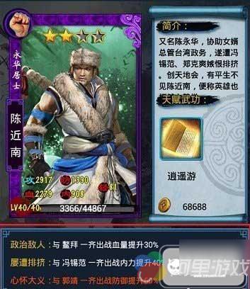 建议郭靖佩戴技能:被动攻击,轻功梯云,漫天花雨(如果没有可以伏魔杖法代替,后面会说明理由)其二,还有不少位置的输出,个人推荐在有足够材料升星的情况下选择陈近南作为其中一个输出点,第一他是郭靖的缘,其二陈近南的缘相当好配,相对来说其攻击的提升是很快的,技能配置推荐被动攻击,缘武功好像叫梅花啥的,还有就是伏魔棍,梯云纵。