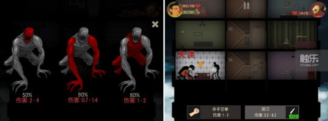 血量和饥饿度是仅有的两个生存数值,每进入一个房间(也就是每走一步)都会消耗1点饥饿。空腹状态下主角不会立刻死亡,但接下来的每次推门都会从HP中扣除2点。由于上述两个数值的消耗度非常快,所以你要时刻留意,另外某些过期食品虽然也能充饥,但可能会导致中毒扣血,全凭你的运气。