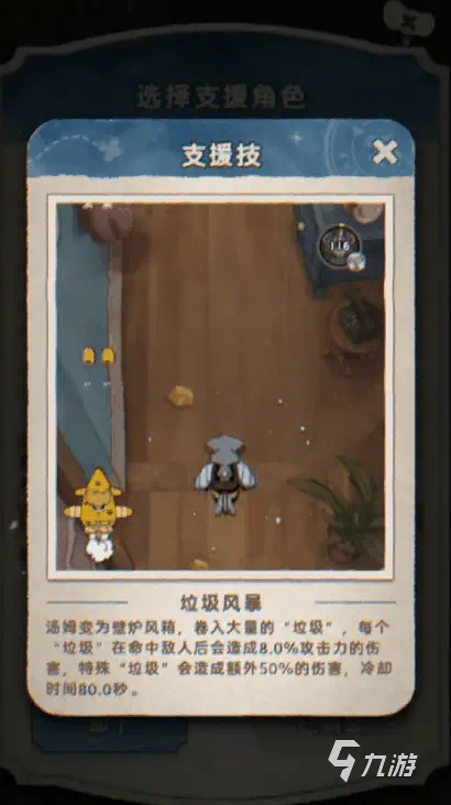 需要注意杰瑞自身不会随时间自动回复能量,每成功发射出一颗水果就能恢复20%,所以玩家要随时丢水果好放出大招,他的专属支援技会让汤姆登场,将杰瑞变成暂时无敌的风箱,吸入大量垃圾,每一个普通垃圾命中敌人会造成8%伤害,特殊垃圾会再造成额外的50%。