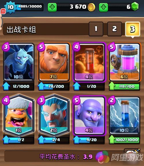 圣水瓶:起手有奶瓶天胡一半,没奶瓶就稍微难打一些,这套牌过牌是弱项,可以用冰法/苍蝇/樵夫过牌,看起手情况而定。这张牌也有很多小技巧,遇到火箭时候放在国王塔前;遇到矿工的时候放在国王塔尽量左右侧,对手过牌拿到矿工时会来挖你的水瓶,拿着冰法/蓝胖/樵夫准备好,直接下在奶瓶的另一边,让矿工享受一下挖到蓝胖的快感吧。