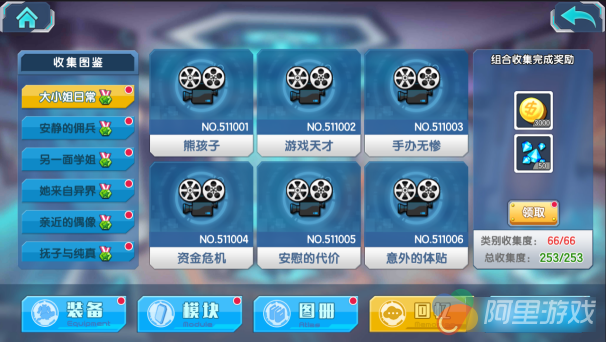 只有收集图鉴功能,完成组合收集可获得奖励。相册相片暂定分为背景图、设定图、特典图。所有相片初始状态为不可查看,取得后方可进入大图。部分图片可设置为主菜单背景。