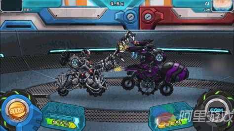任何一个《机器人大战》的粉丝看到这个画面都会激动,尤其是左边的机器人,如此像节目里经典的NPC“骑士”。游戏的核心机制是这样的:左右两边的机器人自动挥动手中的武器,玩家可以用左下角的按钮控制动作的速度,加速需要消耗电量,同时也会积攒热量槽,一旦过热便会陷入失控状态。虽然简单,但也有相当的策略性。