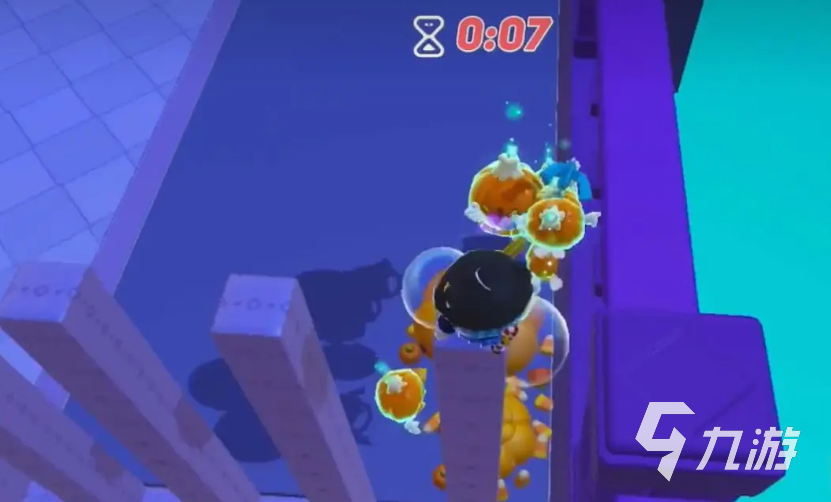 接着是柱子的上面,站在下图柱子上面,哪怕不用躲藏,也能让南瓜无法攻击,从而拖到比赛结束,但是要上去却并不简单,需要献祭一个队友,让队友踩在地下的大南瓜上面,然后把自己给顶上来就可以了。