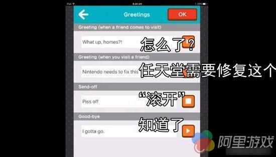 《Miitomo》需要让用户设置一系列的打招呼用语,比如访问朋友家或者朋友来访时的问候语。经过外媒的测试,玩家可以在问候语中输入各种脏话,完全没有任何问题。