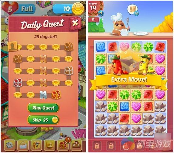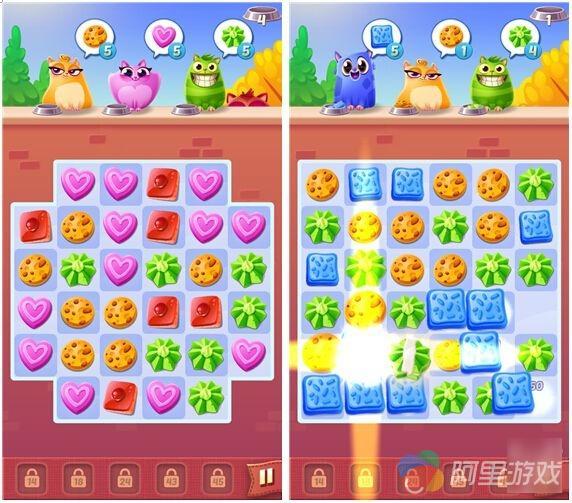 随着游戏的推进,任务的种类以及玩法内容会稍有变化,甚至还有 BOSS 战,玩家需要在特定的步数内通过消除尽可能多的饼干来击杀对方,好在 BOSS 不会还手,否则这些喵星人不得满地找牙啊,可以说同样是连线消除,本作就显得更有可玩性了。