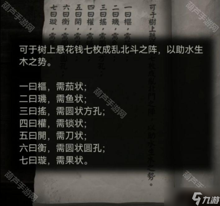 这样我们树上挂的古钱顺序就齐了,调整为第一行是茄状-鱼状-圆形方孔,第二行是锁状-刀状-果状,第三行就一个圆形圆孔,调整完毕后拿到一个小发条,我们里面的吹箫木偶好像有个发条孔,回屋里。