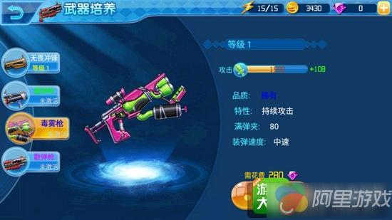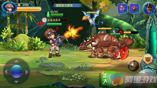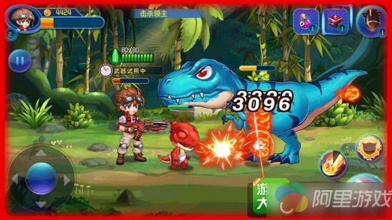 游戏中除了为玩家们提供不同的角色之外,还加入了几种不同的宠物,这些宠物都可以通过一定的花费来解锁,然后就会有一头小恐龙跟随我们一起战斗。除了宠物之外,对于射击游戏来说武器系统是尤为重要的,本作为玩家们提供了四种武器,分别是冲锋枪、榴弹枪、毒雾枪、散弹枪,每一种武器都有不同的攻击方式,当然也只有第一个武器是免费的,后面的武器虽然强大,不过都需要较多的钻石才能解锁,并不太适合普通玩家,好在我们的基础武器可以通过金币升级的方式来提升攻击力,这也算是普通玩家们比较实用的一种增强战力的方法吧。
