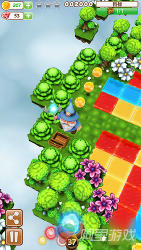 本作的类型有些趋向于还有消除元素的3D解谜。在游戏当中,玩家需要通过施放魔法来改变前面挡路方块的颜色,如果相同颜色的方块连接在一起,就会还原成本来的土地,这时梅林大师就可以继续前进了。改变方块颜色的方法其实也很简单,游戏中的法师会配备一根法杖,法杖最前端显示的颜色就是此时我们能够使用的,当然为了增加游戏的策略性,玩家会预先知道接下来的两个魔法的颜色是什么,这有助于我们提前做好准备。