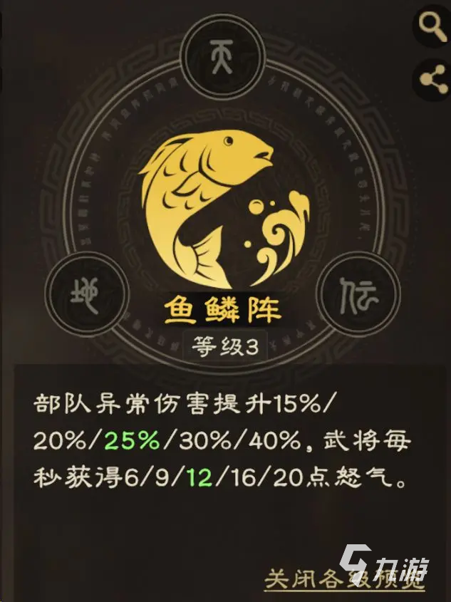 军阶盾兵专精选择异常,可以提高部队的异常状态时间,等到了游戏后期以后,阵容在搭配上可以直接把刘备给换成张角,张角和诸葛五都有着恶搞二的异常伤害以及增伤的效果,搭在一起相辅相成可以组成T0等级的异常盾组合。阵法上以鱼鳞阵优先,鱼鳞阵可以提高部队的异常伤害和武将的回怒加成。
