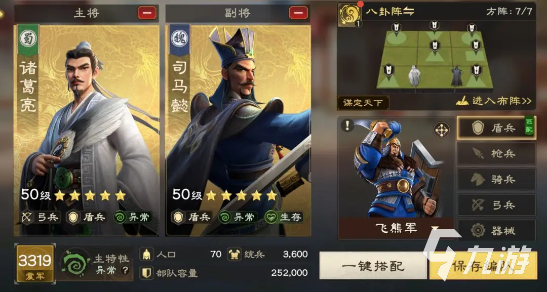 飞熊军是董卓麾下的一支队伍,这个队伍中的成员各个都是身经百战,飞熊军的专属技能在战斗开始以后能够以极快的速度接近目标,部队的一场伤害还能提升8%,比较适合打一场伤害的武将,在阵容上推荐使用刘备、诸葛亮队混搭盾,刘备有着强大的生存能力,可以确保诸葛亮有时间打出高额的异常伤害。