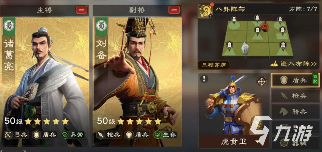 兵种推荐虎贲卫,推荐阵法:天覆阵,核心为治疗,可选择许褚、刘备,来构建生存盾体系,前者提供高额抗性提升,刘备能提高伤害抗性,队伍普攻暴击,技能暴伤都一并降低,抗性足够高,还能给队伍提供治疗效果,让部队拥有很强的生存能力。