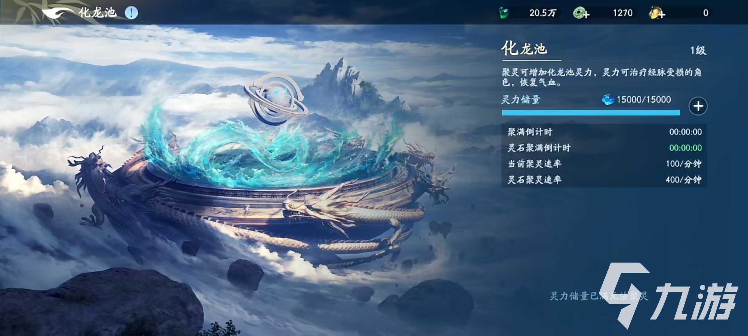 第五个化龙池,作用是用于治疗经脉受损的角色,恢复气血,化龙池有对应的灵力储量,提升等级之后储量也能够增加。通过消耗灵石可以提升聚灵速度,快速获得灵力,也可以在化龙池内使用道具直接获取灵力。除了这些功能建筑之外,仙府中还有源龙树、落星台和玄磁山这三种资源型建筑,分别产出源龙木、星河沙和玄磁晶,这三种材料就是其他建筑升级的基础资源。