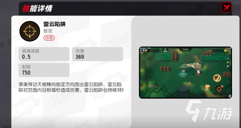 奈美的普攻“雷云陷阱”会挥动手中的天候棒,向着指定方向放出雷云陷阱,陷阱会对范围内的敌人每秒造成一定伤害,总共会存在3秒的时间,她的技能“台风气候”会挥舞着魔法天候棒,向着指定的方向区域发射台风。