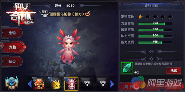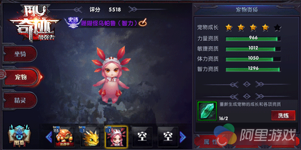 宠物资质属性部分为浮动值,在宠物资质部分可以看到,每条属性有最低值和最高值,玩家获得宠物后,取区间值的随机数值。所以,每个宠物属性都是不同的。如果获得宠物的资质不如人意也没有关系,我们还可以在资质里进行宠物洗练。
