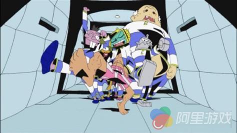 这样一来,当观众在观看这部《Dead Leaves》的时候,最大的感受就是疯狂,其节奏进度也是超快,这边剧情刚开始展开,迅速结束,然后进入下一段情节。使得观众在观看的时候根本没有时间休息,必须一口气直接看到底,但看完后必然会有种酣畅淋漓的快感,然后从而喜欢上这部动画。很多人不能接受这部作品有几个原因,一个是那涂鸦感的红蓝绿色块配色,一个是怪异的人物设定,比如男主角是个方形电视机头(真的可以自豪地说我好方)。在这部动画中,血浆横飞是常见场景,那些主角之外的配角们真的是秒秒钟被爆头的命运,而跟BOSS的对战画面,原本应该比较繁琐的场景,却让人看起来感觉原画师们是很开心地画着。