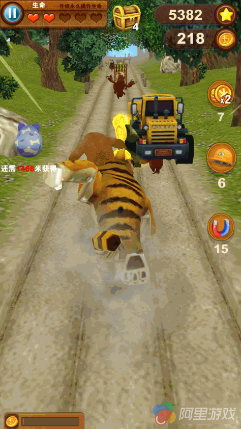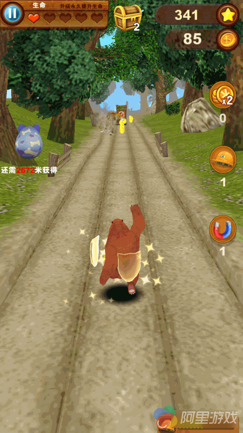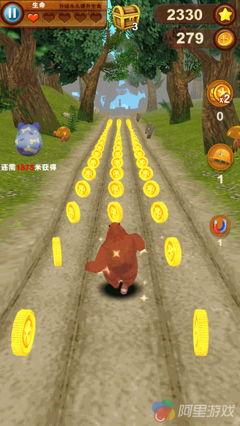 《熊出没之熊大快跑》的操作简单,跟其他的同类跑酷游戏相比基本上没有太大的区别,玩家只需向上滑动屏幕,便可控制熊大跑动或者跳跃,向下滑动屏幕,便可操控熊大向下滑行躲避障碍。游戏操作虽然简单,但是处处充满了挑战,玩家不仅要躲避各种障碍物,还需要吃掉一路上的金币,玩家在收集金币的时候注意不要太过于关注,生存下去才是游戏的第一要素。
