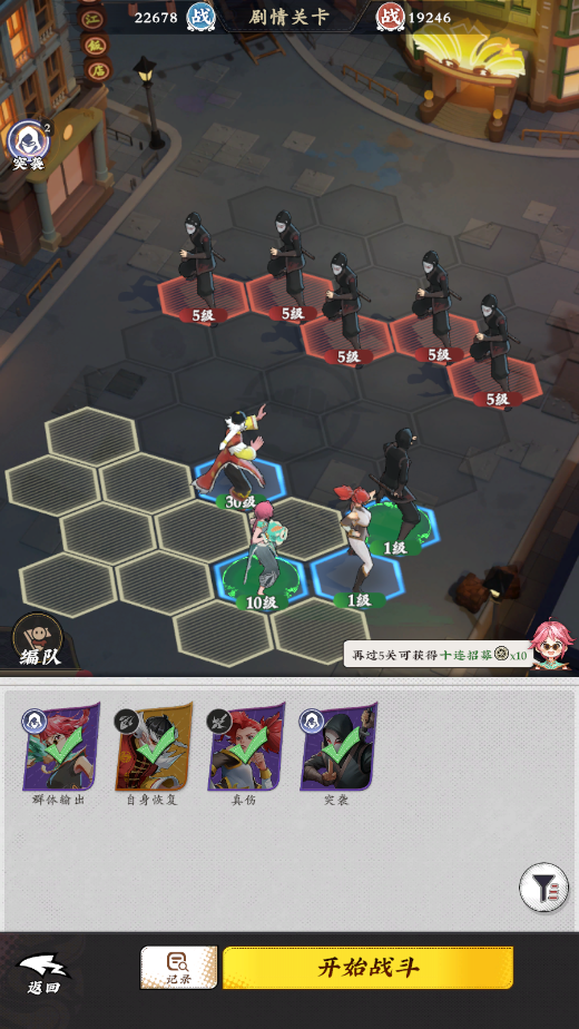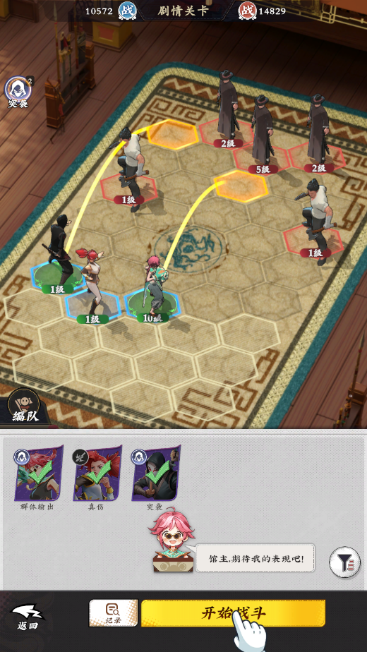 游戏的战斗体系会考验到两个内容:对阵容的搭配和对站位的理解,通过合理的搭配和站位,甚至可以带来以弱胜强、越战力成功挑战。