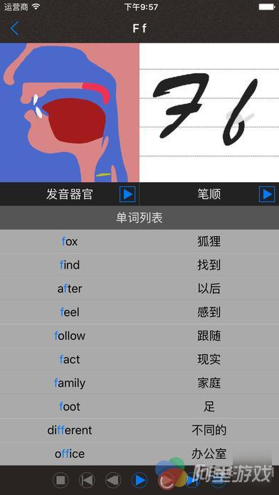 《英文字母》是一款针对英语26个字母学习与训练的必备工具,可以有效地纠正字母的发音和书写。用户可以使用发音器官动画演示了每个字母发音的过程和技巧,使用动画展示了每个字母的书写顺序,包括一般写法和花体写法,提供了丰富的实测训练:字母大小写转换训练,字母排序训练,字母听力训练和字母发音训练。
