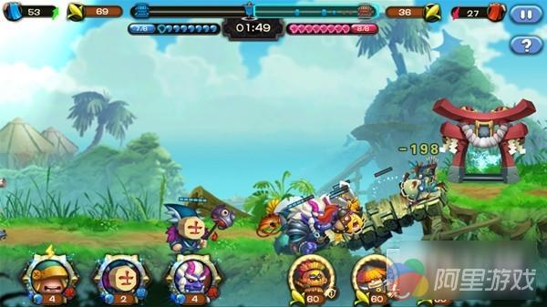 游戏在战斗过程中更偏向于对战塔防的战斗方式,玩家们要做的就是点击屏幕下方的士兵头像即可派遣出战,而战斗则完全有系统自动控制,玩家们不需要进行布阵、技能等操作。对战塔防类的游戏大多如此,不过很多此类型的游戏中都有玩家技能可以使用,这样给玩家们难度就降低了许多,而本作中玩家们只能控制出战士兵的选择,除此之外没有任何控制方式,这倒是需要玩家们对战场的理解和把控更加精准才行。