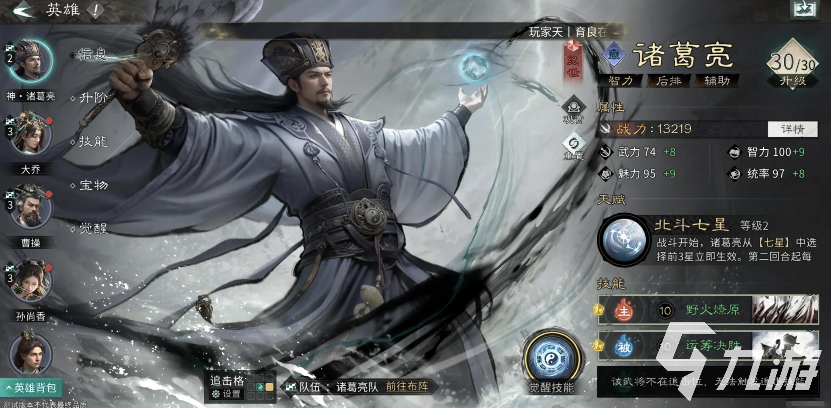 诸葛亮的定位是智将型控场核心,他的“北斗七星”天赋能在每个回合激活不同星辰,触发额外行动、削弱敌军或提升追击概率。比如天权能让队伍获得额外出手机会,天玑在他被攻击时触发反击效果,摇光还能降低敌人技能触发率。这种多变的技能机制,使诸葛亮几乎可以主导整场战局的节奏。