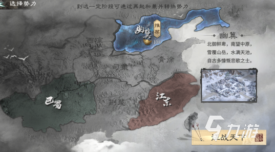 在正式完成角色创建后,就会过一段比较简单的剧情,随后大家就进入到势力选择界面,也就是“落州”,以S1赛季举例,有3大势力可选,魏国的幽冀、蜀国的巴蜀,还有吴国的江东。这几个势力从地图上来看,与较为核心的”司隶”距离差不离,但是这些势力内部城池布局,所处位置都有较大差异,大家可以按照喜好去选择,当然根据系统推荐也是可以的,这是能拿到额外元宝奖励的。