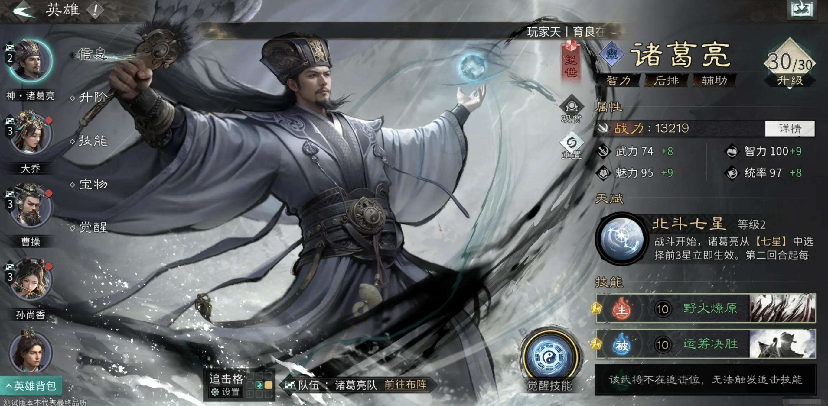 诸葛亮的定位是智将型控场核心,他的“北斗七星”天赋能在每个回合激活不同星辰,触发额外行动、削弱敌军或提升追击概率。比如天权能让队伍获得额外出手机会,天玑在他被攻击时触发反击效果,摇光还能降低敌人技能触发率。这种多变的技能机制,使诸葛亮几乎可以主导整场战局的节奏。