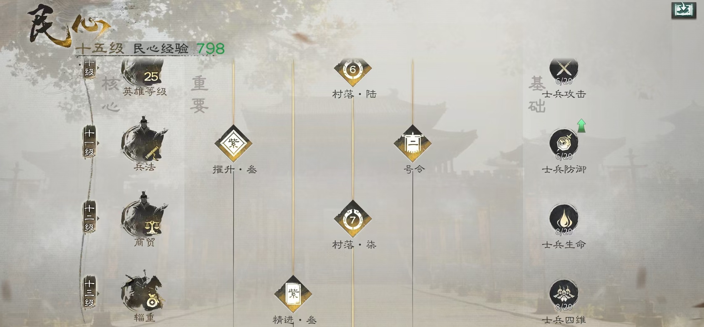 初期阶段自然资源短缺,因此每个途径都不能浪费,除了主线之外,还有以下这些方式获取资源。第一个”归心”,在城池被攻占后,可通过该玩法获得大量资源,比如元宝,装备,以及其他材料和道具。第二个”任务系统”,将主线除外,任务系统里面有国家,日常,循环等任务,也是有大量资源产出的,比如国家贡献,民心经验,元宝之类的。第三个”村落产出”,顺利收服城池,或者剿灭叛军后,就能拥有村落,这也是玩家们的食邑,能源源不断的产出不同材料,这里是有累计上限的,满48小时就不再有产出,所以每天一定不要忘记领取。最后就是“系统玩法”,直接进入到“征战”当中,有战役,夜袭,授业,齐局等,每一种都有对应材料可获得。
