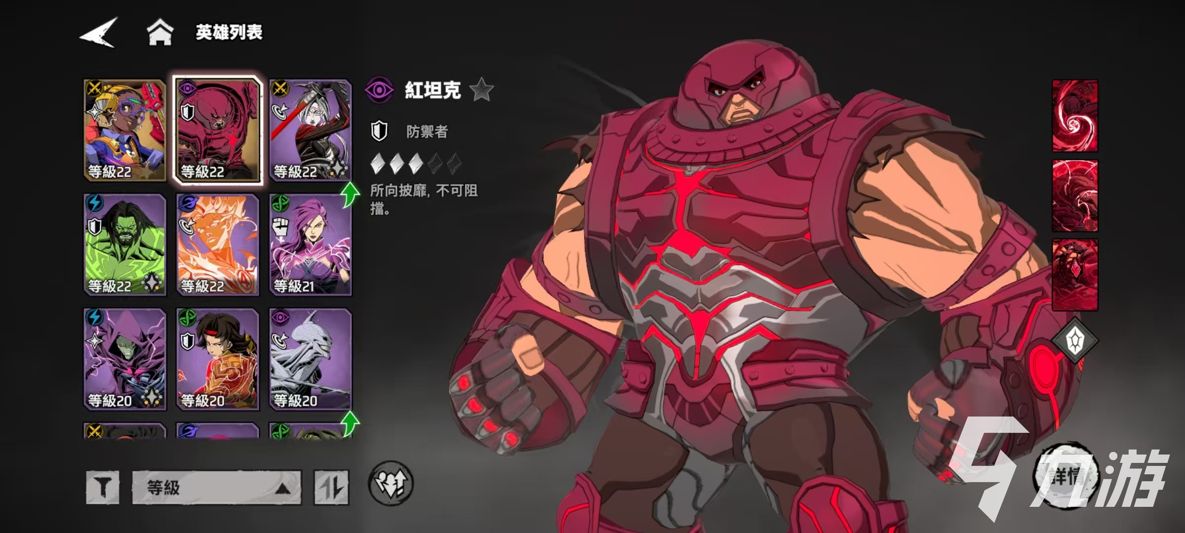在目前游戏的众多防御者英雄中,小编认为最出色的两个当属美国队长和红坦克。其中红坦克是非常纯粹的防御者,自身可以通过战技获得按照最大生命值百分比计算的护盾,并且得到大量终极技能能量。移动技能可以直接冲锋到目标位置,对沿途敌人造成最大生命值百分比的特殊伤害。增益技能可以进入到蓄力状态,停止普通攻击,蓄力时间受到的伤害降低,蓄力结束后,对相邻敌人造成高额特殊伤害。所以红坦克无论是在伤害还是防御方面都极为出色,尤其是自身优秀的生存能力,能扛住大量输出。