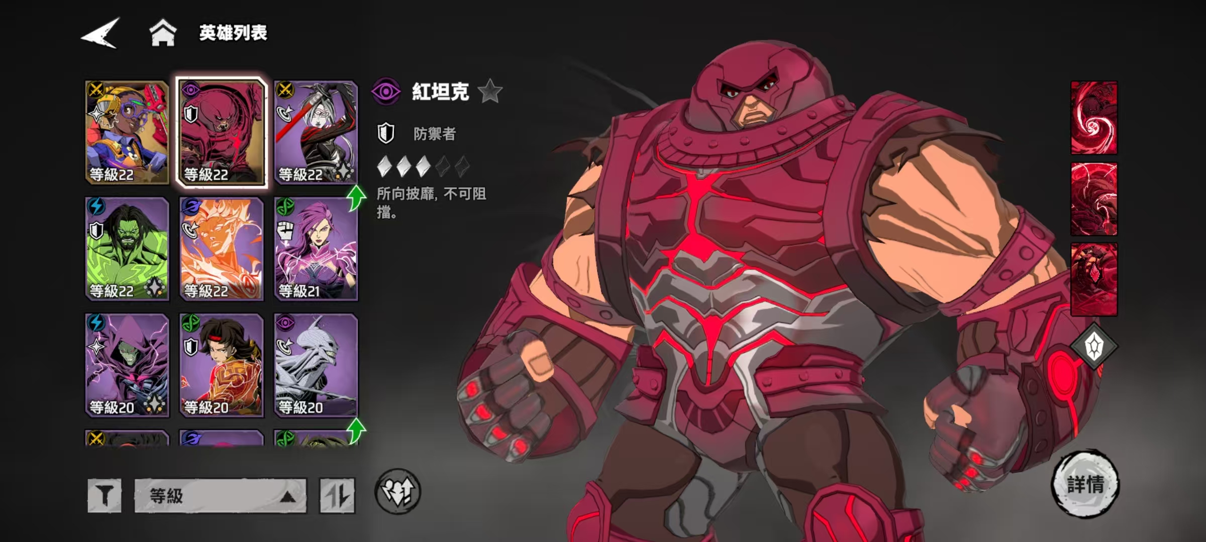 在目前游戏的众多防御者英雄中,小编认为最出色的两个当属美国队长和红坦克。其中红坦克是非常纯粹的防御者,自身可以通过战技获得按照最大生命值百分比计算的护盾,并且得到大量终极技能能量。移动技能可以直接冲锋到目标位置,对沿途敌人造成最大生命值百分比的特殊伤害。增益技能可以进入到蓄力状态,停止普通攻击,蓄力时间受到的伤害降低,蓄力结束后,对相邻敌人造成高额特殊伤害。所以红坦克无论是在伤害还是防御方面都极为出色,尤其是自身优秀的生存能力,能扛住大量输出。