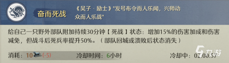 王道的“更戍易帜”会把部队守军变成指定兵种,通常用法是外城的守军变成被我方主力克制队伍克制的类型,打起来简单在首战高级地有奇效,“死战”能带来15%增伤减伤,但死兵率会增加50%,点满会额外增加30%战功,并降低使用时的虎符消耗,这个能用死兵率为代价提供强大战斗能力,适合在重点战役撕开对方防线,“重振哀兵”会根据兵损获得粮食,建议和死战一起开启减少损耗,贯穿王道高活跃持续骚扰的战场定位。