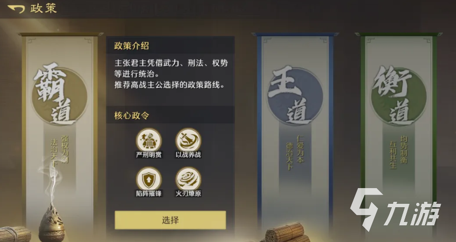 政策主要有3个分支,分别是霸道、王道和衡道,霸道是战斗玩家首选,能在多项战斗增益的叠加下,感受战力增长的喜悦,王道适合高活跃度的,能通过短期高效的战斗命令得到资源差,对于在线时长有一定要求,衡道是辅助的典范,能通过送粮,给盟友吹号角以及增大土地产量来提供多个增益,推荐喜欢结交朋友的选择。