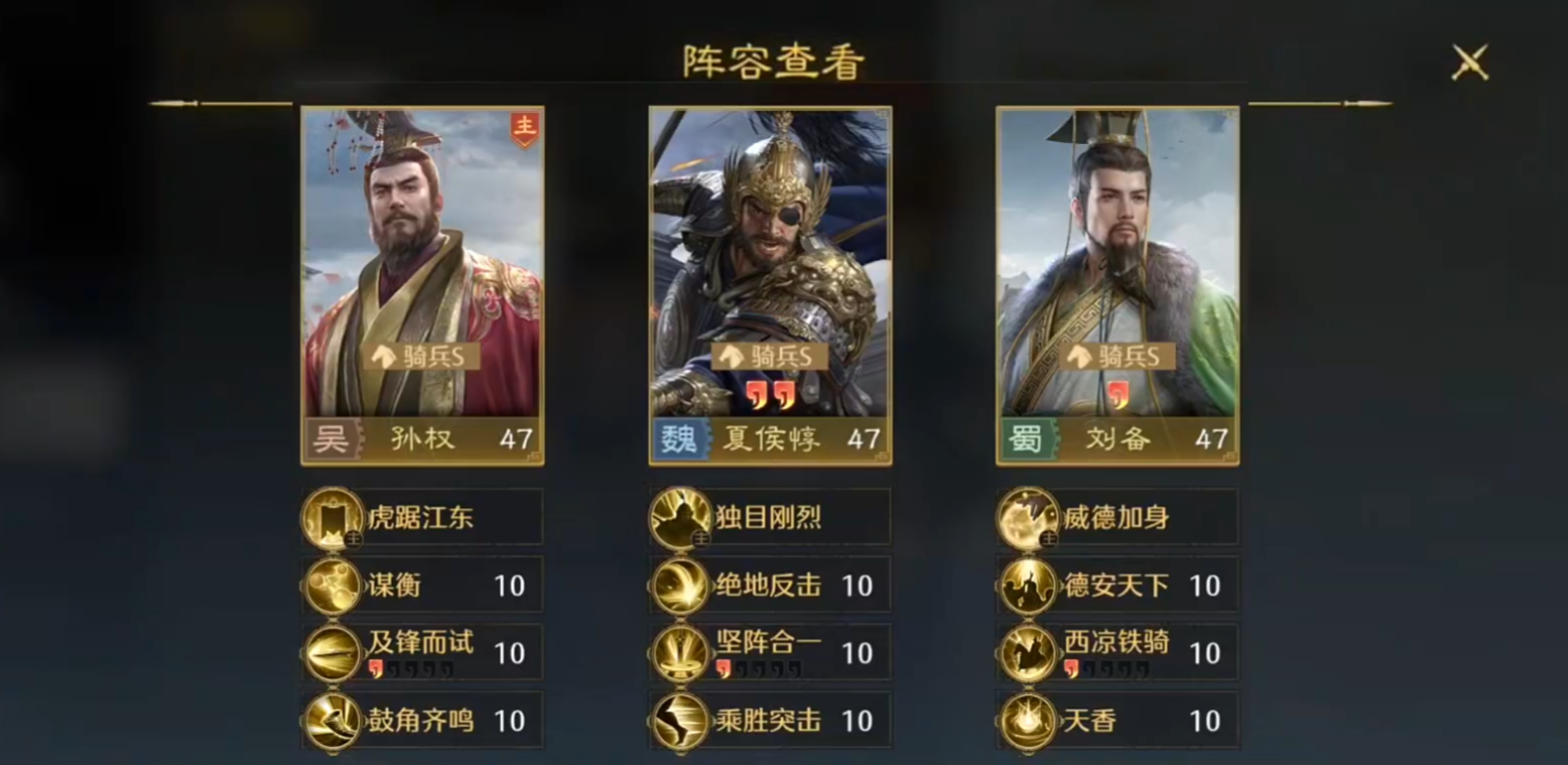 实战思路:在实战中关刘马与注重控制的兴汉枪的思路截然不同,主动放弃控制思路改为寻求更高的输出。关羽站主将位,靠主动技能搭配强袭、斩将夺锋/重创,给马超创造极佳的输出环境;刘备则负责保底续航,被攻击时的回血让你有足够时间操作队伍穿插敌阵;再加上【斩将】【强袭】对马超的输出增益,整套阵容的爆发能力直接拉满。