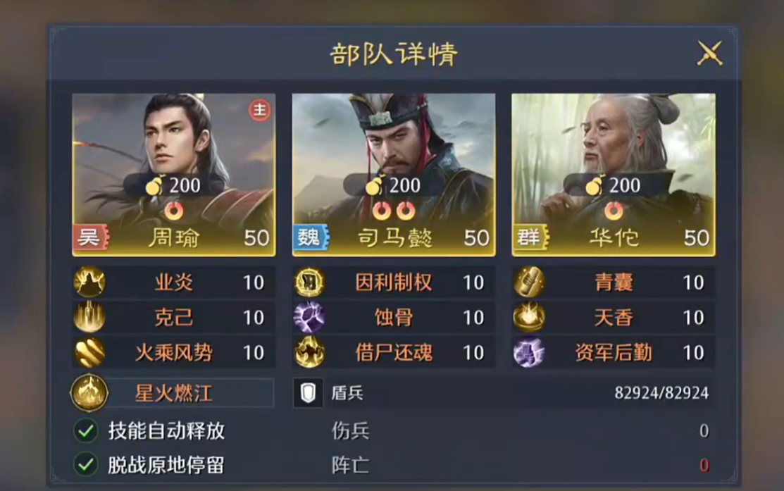 励军:适合辅助武将选择,为全队提供减伤和续航能力,推荐刘备、曹操、大乔、华佗、貂蝉等。