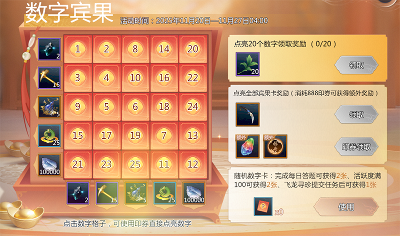 数字宾果调优再启,使用印券翻开指定数字时所需的印券数将大幅下调,活动期间完成指定玩法可以获得随机宾果数字卡,完成宾果数字卡收集可获得蒙尘的定敕符章(七阶)、岁华葫芦、潜龙锥、灵息玉等好礼,更有万象灵石、灵核任选、特殊称号等你来领!