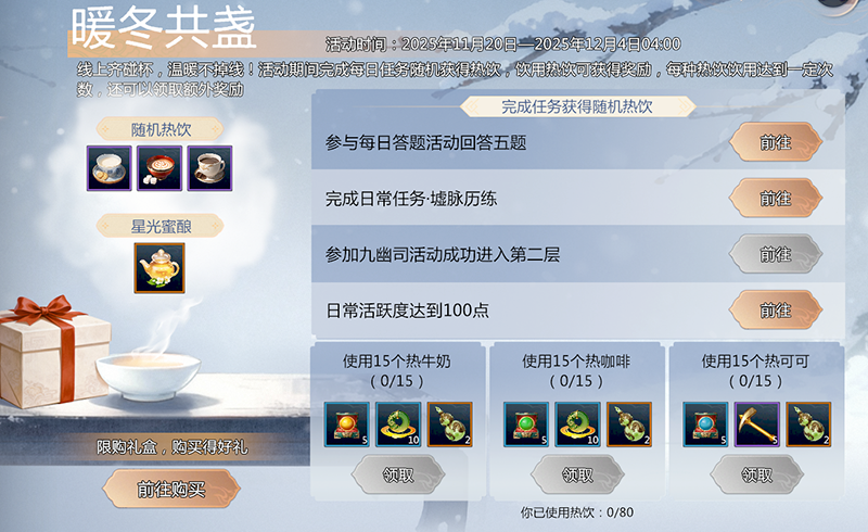 少侠每日完成指定任务将可获得各色冬季暖饮,使用暖饮有机会获得聚灵葫芦、潜龙锥等好礼,使用暖饮达一定次数,还可领取额外丰厚大礼!