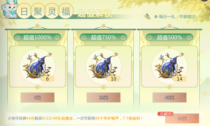 活动内容:新增【限时福利礼包】及【日聚灵福】每日折扣葫芦礼包。更新后,特殊情况下将触发超值【限时礼包】,【福利】-【日聚灵福】新增每日折扣葫芦礼包,各位少侠切勿错过折扣。