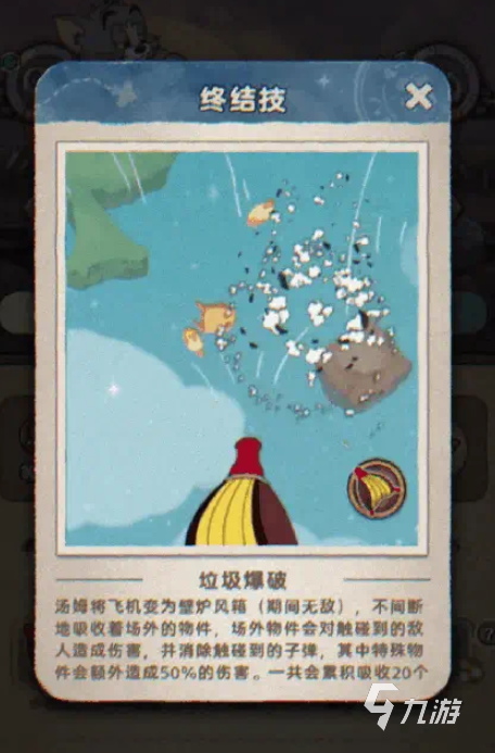 垃圾爆破变壁炉封箱这就是一个终极技能,一旦在释放之后,汤姆的飞机马上就会变成壁炉风箱,在这个过程中就会处于无敌的状态。而且还会不间断的吸收场外的物件,这些物件一旦在碰到敌人之后,马上就会造成伤害,同时也可以把所有触碰到的子弹全部的消除。其中特殊的物件还会额外的产生50%的伤害,整个技能还会累积吸收20个场外物件。不仅可以高效地清理小兵,而且还可以有效保证自身的安全,简直就是团队中的杀气担当。