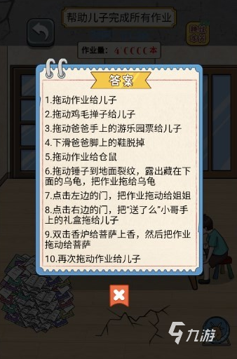游戏以关卡制为主,玩家需通过观察场景、收集线索并运用逆向思维破解谜题,比如大家可以主动去帮助儿子完成作业的关卡中,拖动物品触发特定事件推进剧情,其中部分关卡还融入彩蛋,增加体验时的趣味性效果。