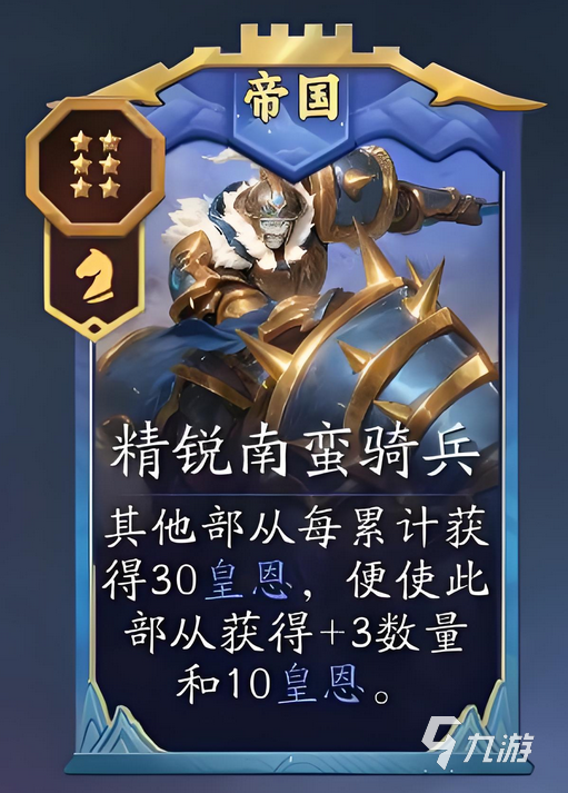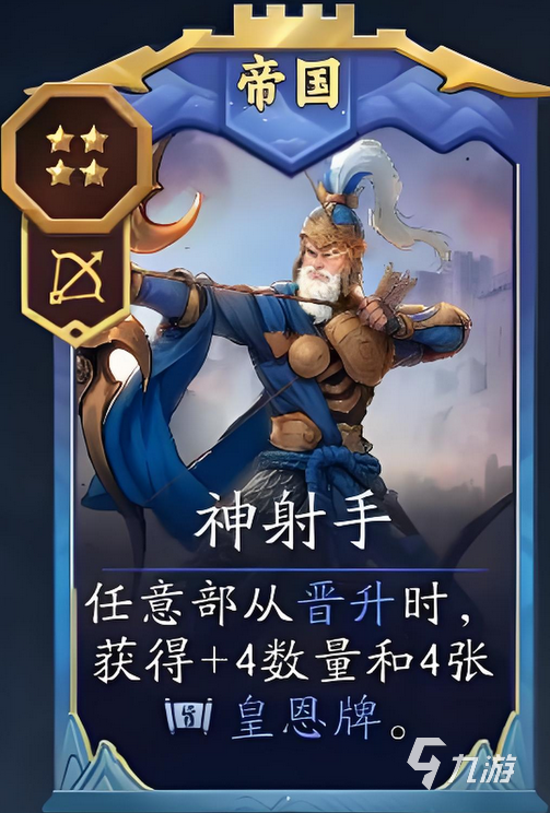 这是帝国的专属幻神,同时也是个下限非常高的英雄,想要使用这个英雄吃分还是相当容易的。被动效果“率土永昌”,皇恩牌额外提供1点皇恩,只有在手中皇恩牌使用后才能获得额外皇恩。作为限定种族的幻神,在搭配此种技能效果情况下,就必须携带神射手的部从,这是刚需,在任意部从晋升时,就能获得4张皇恩牌,只要找到1个神射手,就能对皇恩进行少量积攒。属于必须手中有几张关键牌才能玩起来的角色。