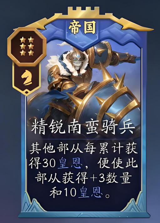 这是帝国的专属幻神,同时也是个下限非常高的英雄,想要使用这个英雄吃分还是相当容易的。被动效果“率土永昌”,皇恩牌额外提供1点皇恩,只有在手中皇恩牌使用后才能获得额外皇恩。作为限定种族的幻神,在搭配此种技能效果情况下,就必须携带神射手的部从,这是刚需,在任意部从晋升时,就能获得4张皇恩牌,只要找到1个神射手,就能对皇恩进行少量积攒。属于必须手中有几张关键牌才能玩起来的角色。