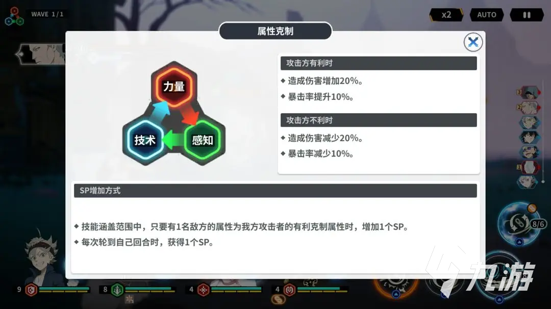 由于游戏里的角色释放大招需要攒够8点的sp才能够释放,因此我们首先要攒sp,攒sp的途径一共有三个,每回合自动可以获得1点的sp,部分的角色技能也可以提供sp,第三个就是使用克制的属性攻击敌人可以获得1点的sp,属性克制的重要性这也更加强调了队伍的配置了,不过游戏很贴心,在战斗的时候会在敌人身上标注出克制关系,而且克制关系也就只有三种。这里还要格外的提一下角色的连携技能,如果角色之间存在羁绊关系,技能会获得强化。