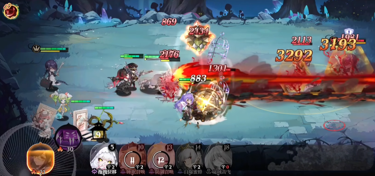 战斗开始时,为随机2个敌人附加【点燃】,每回合有概率为随机1个敌人附加【点燃】效果。技能升级2级后,每回合附加【点燃】概率提升,升级3级后,战斗开始时附加【点燃】人数增加3个,能够使敌方群体战斗开局快速减血,有助于我方快速收割目标。