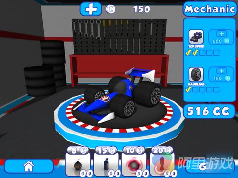 在比赛开始前玩家可以选择自己的座驾,游戏中的赛车与武器道具都是可以进行升级与购买的,而要完成这些需要花费一些银币,这些银币除了玩家可以在完成比赛之后根据表现获得之外,在比赛的赛道上也会散落着钱币与道具,玩家驶过之后即可收集。游戏中为玩家准备了不同的赛车与赛道,不过玩家要想解锁这些元素,可是需要花费一些功夫的。