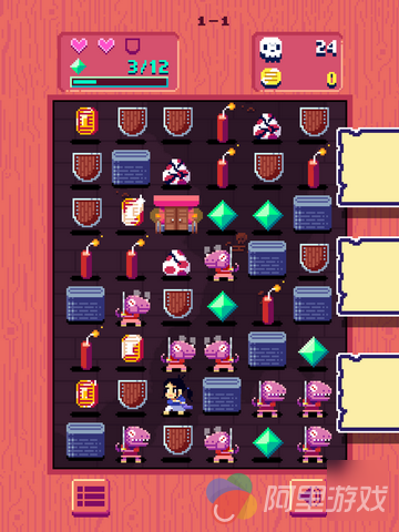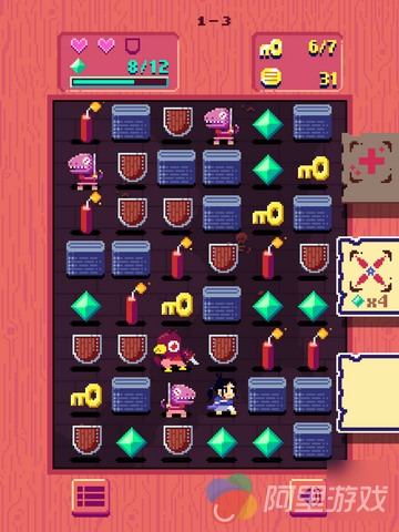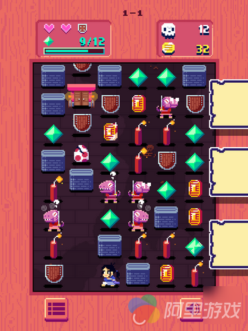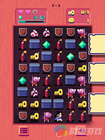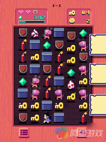 作为一款通关式游戏,相应的敌方势力绝对是不容忽视的一环,而在本作当中,这些内容全部被包含在了场景之中,游戏开始时玩家会注意到场景之中有很多颗蛋,这些蛋会经过几个回合的孵化之后变成恐龙,而这些恐龙就是我们需要面对的敌人。设定上,基本的杂鱼型恐龙为1血1攻,对于主角这种1攻2血1防的大佬来说,简直是一刀一个小朋友。不过游戏难就难在当这些恐龙成型之后,它们会开始在棋盘格上随机移动,这种毫无策略可言的乱拳就让游戏有了更多的变数,由于不清楚敌人接下来怎么走,所以我们只能顾好自己。