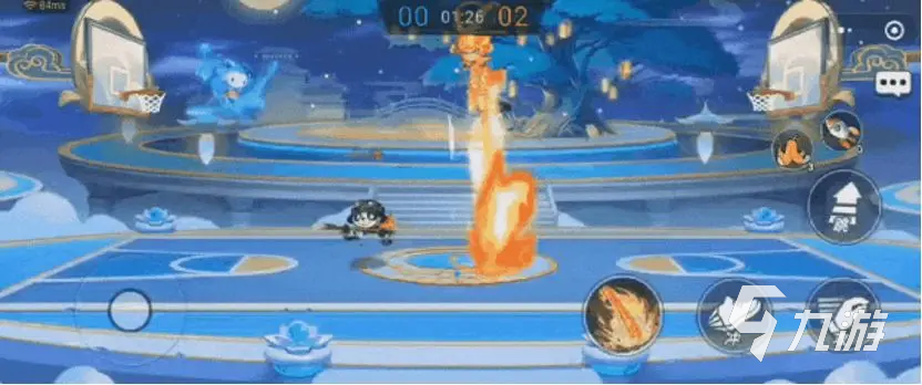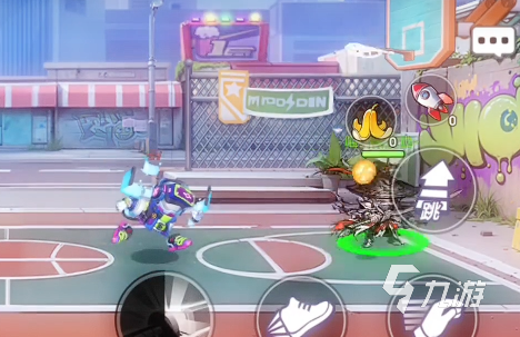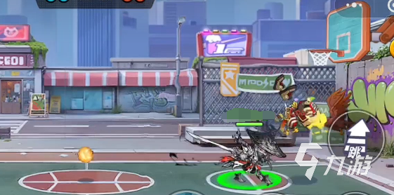 场内操作界面中将会有摇杆、跳、攻、投、冲、盖帽和技能,摇杆能控制角色移动,只要将其向着左右拖动,角色就会向着相应位置移动,跳点按一次,角色会进行一次跳跃动作,若是点按两次会进行一次高度跳跃,此时可以拦截到对手抛出的高球,需要注意若处于持球中无法进行两次跳跃,攻点按角色会向前拍打,命中敌人会削韧,连续击打时会将对手给击飞倒地,并击落对手手上的球,如果在空中状态使用,会变成向前拍击截击;